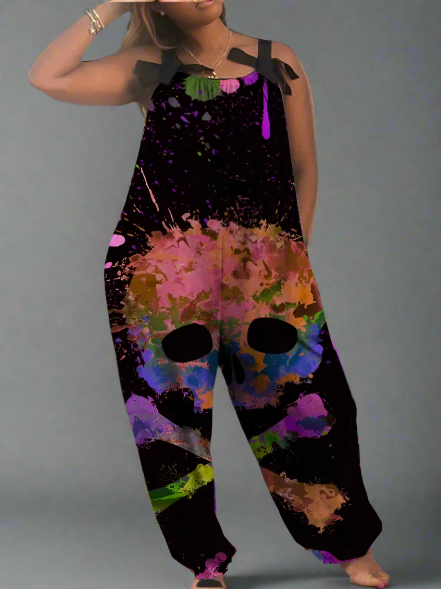 2.Women’s Gothic Skull Print Wide-Leg Jumpsuit – Punk Halloween Streetwear Rompers | High-Waist Full-Length Overalls for Spring, Summer & Autumn
