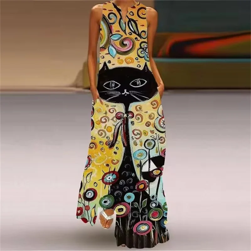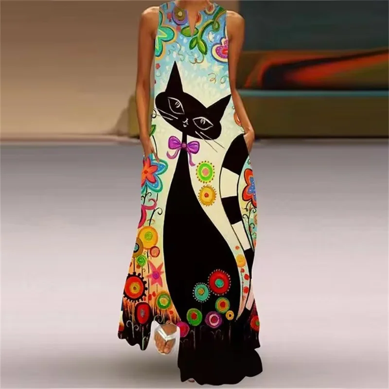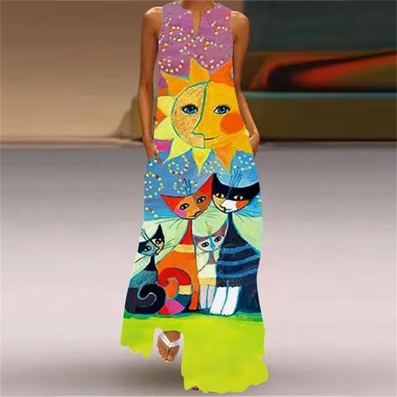 Summer Fashion V-Neck Sleeveless Maxi Dress with Cute Cartoon Cat Print & Pockets Collection
